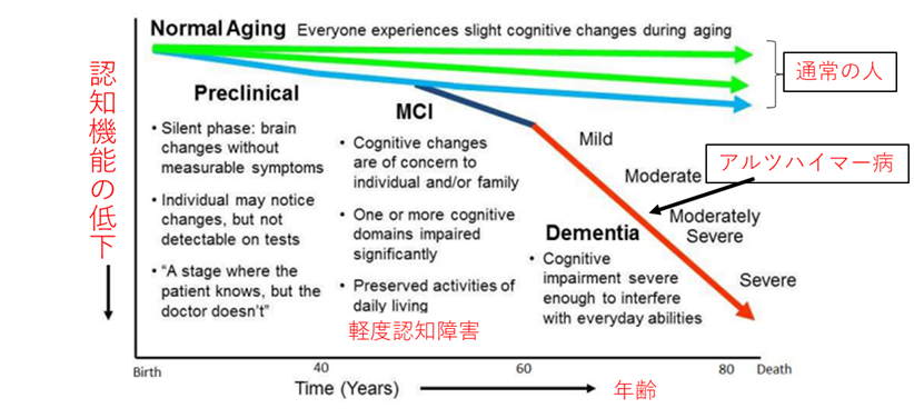 下図に示すように個人差はありますが、通常の人でも年齢と共に認知機能の低下が起きますが、アルツハイマー病の人では、年齢と共に認知機能が早い速度で低下していき、高齢になると日常生活ができないほど悪化します。このように、アルツハイマー病は高齢者に多い認知症ですが、働き盛りで発症するケースもあり、特に、65歳未満で発症するものを「若年性認知症」といいます。