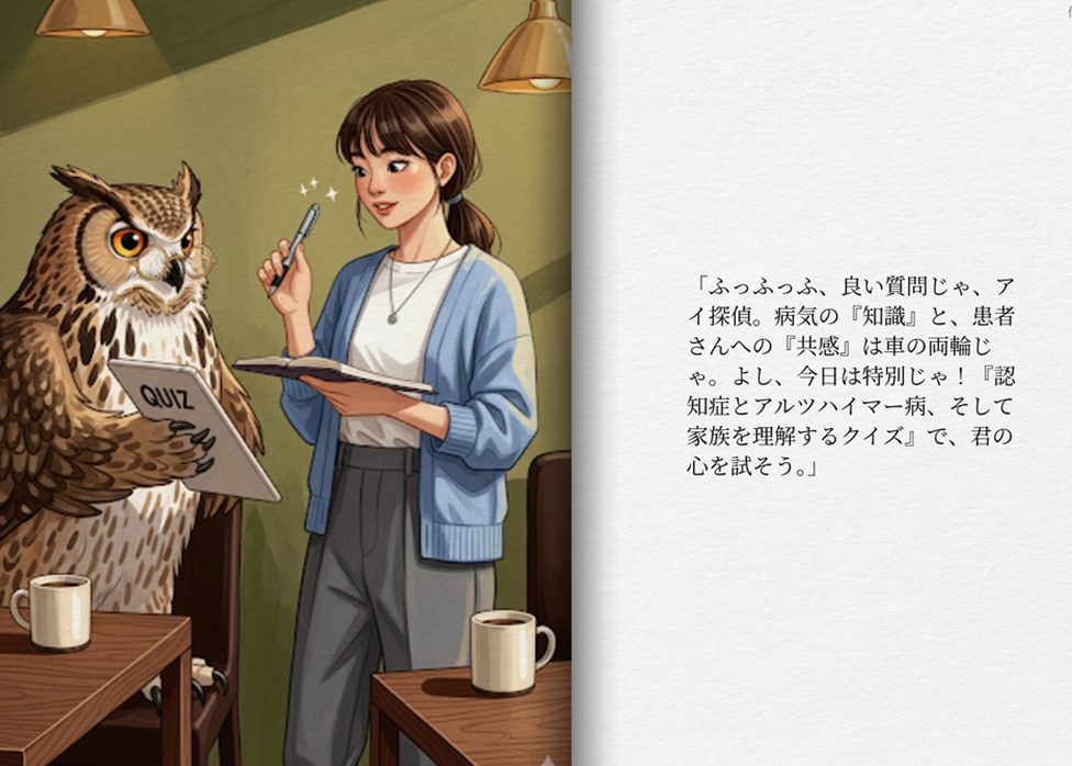 前回の学びを終えたアイは、治療薬だけではなく「患者さんの心」について知りたいと感じていました。「フクロウ博士、薬で病気の進行を遅らせることは分かったけど、病気と向き合いながら『自分らしく生きる』には、どうすればいいんだろう?」